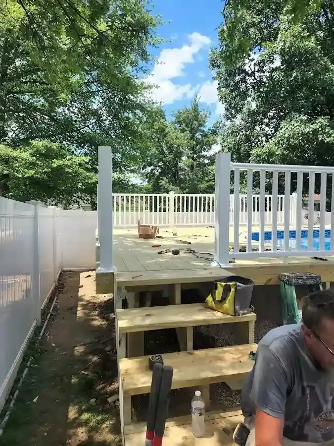 Explore our pool deck projects featuring strong, safe, and beautifully crafted designs built to enhance any outdoor space. Each installation, whether a full pool deck or custom wood deck built around the pool, is constructed with durable, weather-resistant materials. We focus on secure framing, smooth finishing, and precise board placement to ensure comfort, safety, and long-lasting performance. These images highlight how our craftsmanship transforms pool areas into inviting spaces for relaxation and entertainment.